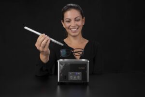 Die Pinzette aus rostfreiem Edelstahl ermöglicht ein einfaches und bequemes Herausnehmen der Brille aus dem Ultraschallbad. Die Silikonspitzen schützen die Brille vor einer Beschädigung, die Rillen sorgen für einen sicheren Halt. Mit einer Länge von rund 30 cm liegt die Pinzette gut in der Hand.